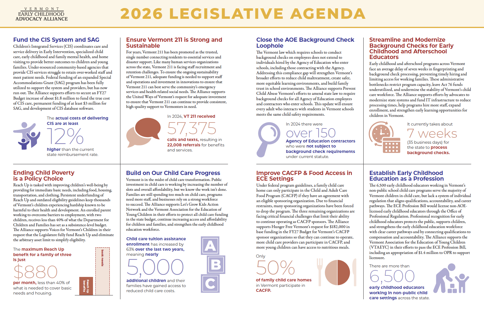 | |  | Alliance Releases 2026 Legislative Agenda The Alliance's Legislative Agenda is crafted annually in partnership with early childhood organizations that are advancing policy solutions through the legislative process related to health, safety, food security, economic security, and early childhood education. The issues on our ‘26 Agenda, listed below, were selected by the Alliance's 21-member Steering Committee. One or more lead organizations will direct legislative and advocacy strategy on each issue. A downloadable PDF of this year's Legislative Agenda is available on the Alliance's website. We look forward to working together! For questions, please contact Matt Levin, Executive Director at matt@vecaa.org. | | | | Issue Summaries: Background: Children’s Integrated Services (CIS) coordinates care and service delivery in four key areas – Early Intervention, specialized child care, early childhood and family mental health, and home visiting – to provide better outcomes to children and young families. Recent state investments have not substantially improved the ability of the under-resourced community-based agencies that provide CIS services to retain over-worked staff and meet patient needs. A study conducted by Burns and Associates in 2024 determined the actual costs for CIS providers were 12% higher than the current reimbursement rate. Federal funding of an expanded Special Accommodations Grant (SAG) program has been fully utilized to support the system and providers, but has now been fully expended. Proposal: The Alliance supports efforts to secure: 1) an FY27 Budget increase of about $1.8m to allow for full funding of the per member/per month rate of $738 identified by the recent study of the true cost of care; 2) identification of a permanent funding source that will provide at least $3 million in annual funding to the SAG program; and 3) full funding for the development of CIS data management software. Lead Organization: Vermont Early Childhood Advocacy Alliance | | | | | Background: Vermont is in the midst of a child care transformation. Since Act 76 was passed in 2023, increased public investment has lowered child care costs for thousands of families, increased compensation for early childhood educators, and allowed new programs to open and existing programs to expand. Over the past two years, over 100 new child care programs have opened, over 1,700 new child care spaces have been created, and child care tuition assistance enrollment has increased by 63%. But families are still spending too much on child care, programs need more staff, and businesses rely on a strong workforce to succeed. Proposal: The Alliance supports Let’s Grow Kids Action Network and the Vermont Association for the Education of Young Children in their efforts to protect child care funding in the state budget; increase access and affordability for children and families; and strengthen the early childhood education workforce. Lead Organizations: Let’s Grow Kids Action Network (LGKAN) and Vermont Association for the Education of Young Children (VTAEYC) | | | | | Background: SNAP, known in Vermont as 3SquaresVT, is a federal nutrition program that provides monthly funds to low-income people to buy groceries. 3SquaresVT is administered by the VT Department for Children and Families, which reviews applications and determines eligibility. The federal reconciliation package passed July 2025 shifts a higher percentage of the cost to states to administer SNAP, and will require Vermont to cover 25% more of the cost beginning October 1, 2026. This change will mean an estimated $8.4 million annual increase in costs to Vermont, which would amount to approximately $6.3 million in costs for State Fiscal Year 2027. Adequate state funding to continue operating 3SquaresVT at current levels will ensure greater food security and health outcomes for families with young children. Proposal: The Alliance supports Hunger Free Vermont’s request to the Legislature to appropriate the necessary state funding to cover the increased cost to administer 3SquaresVT. This program must remain available, accessible, and functional for Vermonters, and for families of young children in particular, who depend on 3SquaresVT to put food on the table at home. Lead Organization: Hunger Free Vermont | | | | | Background: The State of Vermont does not raise enough revenue to meet Vermonters’ needs. This lack of sufficient state revenue has resulted in chronic underfunding of state programs and services, including programs that impact young children – investments in early childhood health and welfare, economic security, food security, and more. This underfunding will be exacerbated by federal funding cuts, putting added pressure on the state budget and further reducing the State’s ability to ensure that all people have the basic resources and support that they need to thrive. At the same time, wealth and income inequality have grown, resulting in a population of wealthy Vermonters who are able to pay significantly more in taxes than they currently are – and who are set to receive significant federal tax cuts due to recent Congressional action. The state must raise revenue from those who can afford to pay. Proposal: The Alliance supports the Fair Share for Vermont Campaign in advocating for a tax increase on all people in Vermont earning more than $500,000 per year. This tax increase would claw back a portion of the $57,000 average annual federal tax cut that the wealthiest Vermonters are set to receive under the One Big Beautiful Bill Act, and will generate over $100 million annually for the state to improve public goods and services and increase resilience to federal funding cuts. Lead Organization: Fund Vermont’s Future Campaign | | | | | Background: Homelessness in Vermont impacts at least 4,500 people, including more than 1,000 children, and represents one of Vermont’s key barriers to early childhood health, safety, food sec