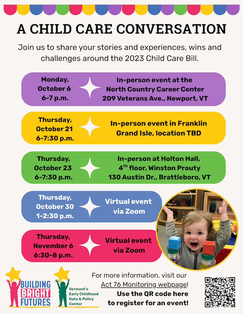 Building Bright Futures (BBF) is hosting a series of fall forums as part of Act 76 monitoring to listen and learn from Vermont communities. These sessions will focus on what is working well in Vermont’s child care system and where challenges remain.