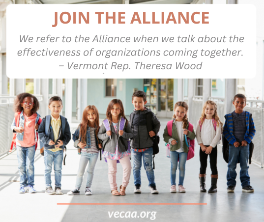 Join the Alliance as a Member for 2025-2026! The Alliance’s 2025-2026 membership cycle is open – join us today! Our annual membership cycle runs from November through October, and memberships are accepted throughout the year. Join the Alliance’s coalition of early childhood professionals and providers, parents, organizations, and businesses collaborating to support advocacy that improves the lives of Vermont’s young children. The Alliance helps diverse stakeholders work together to amplify early childhood voices, influence policy making, and realize the promise of every Vermont child. Members actively share information, data, and strategies – and the victories we can achieve together. By joining the Alliance, you will be saying “count me in” to partners from around the state. Individual membership fees are by donation, and organizational fees depend on the size of the organization. Find more information about membership on our website or reach out to the Outreach Manager, Taylor, at taylor@vecaa.org. | |