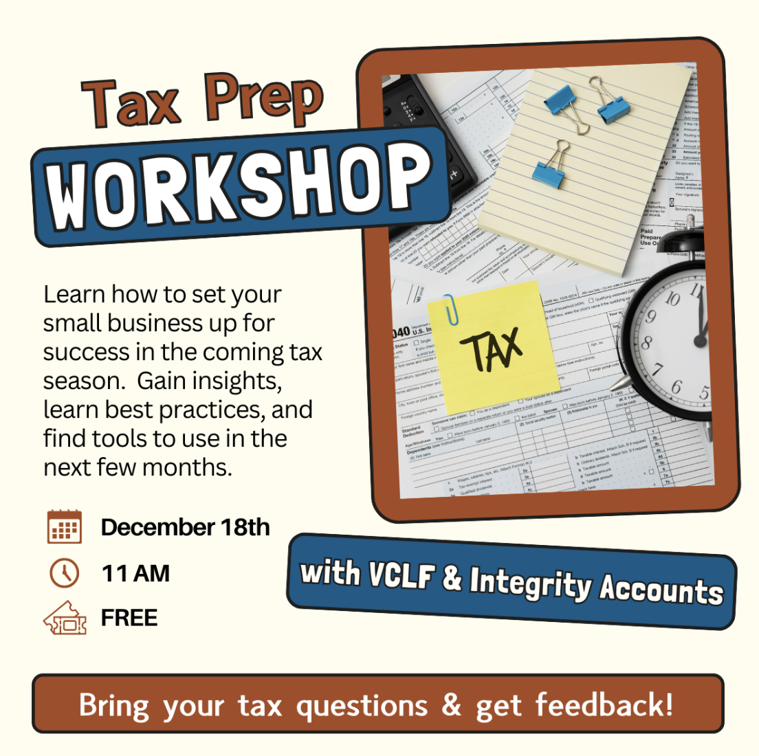 The Vermont Community Loan Fund (VCLF) is holding a virtual Tax Preparation Workshop on December 18 at 11:00 am.  This event is perfect for small business owners and staff looking to proactively prepare for tax season. Learn about valuable insights, best practices, and helpful tools.