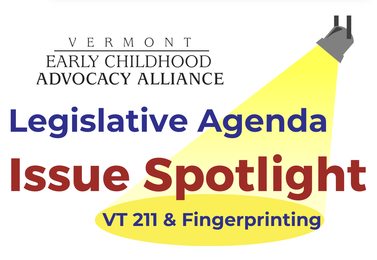| | | | Lead Organization United Ways of VT The mission of the United Ways of Vermont (UWsVT) is to provide a forum for mutual support and training for local United Ways. UWsVT keeps a broad, statewide perspective and supports each local United Way by encouraging collaboration and providing support. Vermont 211 is a program of UWsVT. | | | | | | Fingerprinting: Streamline and Modernize Background Checks for Early Childhood and Afterschool Educators Early childhood education and afterschool programs across Vermont are experiencing long delays in fingerprinting and background check processing, which prevents new staff from being hired quickly. These delays, which average seven weeks, directly impact program capacity and family access. Faster hiring will ensure programs can operate at full capacity, reduce waitlists for families, and make full use of the additional state investments made through Act 76. The Alliance supports advocates’ effort to secure improvements to state administrative systems and data infrastructure to allow for decreases in processing time. These changes, in both the short- and long-term, will result in additional hiring, more stable staffing, expanded access for families, and stronger support for children’s early learning. Legislative Update The state has been awarded a Preschool Development Grant (PDG), with $1 million allocated toward addressing the fingerprint/background check delays. We believe that this money will be used for IT solutions that will modernize and automate the backend processes for handling these requests. We're actively engaging with legislators to bring them up to speed on the progress; however, we're requesting that when they have an opportunity to ask leaders at CDD, DCF, and DPS about their budgets, that they also ask for information that specifically details how the money will be deployed and an anticipated timeline for achieving faster turnaround times. | | | |  | | | | | Lead Organizations YMCAs of Northern New England The Y is one of the nation’s leading nonprofits that strengthens communities through the impact areas of Youth Development, Healthy Living, and Social Responsibility. Every day, the Ys work side-by-side with their neighbors to make sure that everyone, regardless of age, income or background has the opportunity to learn, grow and thrive. The YMCA Alliance of Northern New England supports collaboration amongst the region’s Ys and community partners to increase their impact and advocate for positive change in their communities. Vermont Head Start Association VHSA works extensively with state and local organizations and their leaders in early education and child care. As a result of these partnerships, young children and their families receive the services they want to be successful. VHSA and their partners help with coordinating health, mental health, oral health, children with special health needs, transitions, housing, food, and many more services. | | | | | |  | Alliance ‘26 Legislative Agenda Issue Spotlight – VT 211 and Fingerprinting – 2/9 In the coming weeks, the Alliance is hosting virtual Issue Spotlights that will focus on one or two issues from the Alliance’s 2026 Legislative Agenda. In discussions led by representatives from the issue’s Lead Organizations, participants will be able to ask direct questions and hear a brief legislative update. The next session will be held Monday, February 9, at 3:00 pm, and will focus on the request by the United Ways of VT for adequate investment to ensure that Vermont 211 can continue to provide consistent, high-quality support to Vermonters in need, and on the efforts by advocates to secure improvements to state administrative systems and data infrastructure to allow for decreases in processing time. Hosted by the Alliance, United Ways of VT, the VT Head Start Association, and the YMCAs of Northern New England, this session is a great opportunity to learn more about these important issues, where they stand in the Legislature, and how to get involved. | | | | | |  | | | | | The Vermont Early Childhood Advocacy Alliance is a statewide coalition formed in 2000 of early childhood professionals, parents, organizations, businesses, and strategic partners committed to improving public policies that impact young children between birth and age eight in the areas of health, safety, food security, economic security, and early care and education. The Alliance crafts an annual Legislative Agenda in partnership with early childhood organizations, provides year-round advocacy support, and facilitates meaningful interactions with policymakers at key times during the decision making process. | | | | 7 School Street | Montpelier , Vermont 05602 vecaa.org The Vermont Early Childhood Advocacy Alliance is a program of the Vermont Community Loan Fund. | | | | | | | | | |