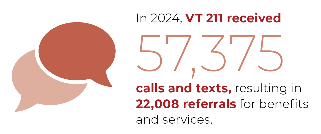 February 11 (2/11) is 211 Day, a celebration of 211 and a chance to raise awareness of our critical services. We will be in the Card Room at the State House from 8:30am to 3:30pm speaking with legislators and advocating for our full funding level. | | | |  | Data and Talking Points - In 2024, VT 211 received 57,375 calls and texts, resulting in 22,008 referrals for benefits and services