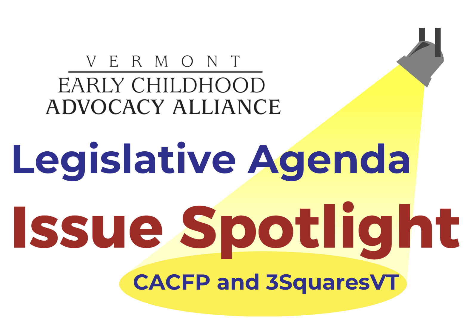 | | | | Lead Organization Hunger Free Vermont Hunger Free Vermont is the statewide nonprofit organization that advocates and educates to bring a permanent end to hunger in Vermont through systemic change, universal strategies, and community collaboration. Since 1993, Hunger Free Vermont’s outreach programs have substantially enhanced Vermont’s nutrition safety net. We work to expand access to the federal programs that provide nutritious foods for school, child care, summer and afterschool meals, and to expand access to 3SquaresVT (known nationally as SNAP), which provides healthy food for Vermonters at home. | | | | | |  | Alliance ‘26 Legislative Agenda Issue Spotlight – CACFP and 3SquaresVT – 3/16 In the coming weeks, the Alliance is hosting virtual Issue Spotlights that will focus on one or two issues from the Alliance’s 2026 Legislative Agenda. In discussions led by representatives from the issue’s lead organizations, participants will be able to ask direct questions and hear a brief legislative update. Our next session will be held Monday, March 16, at 3:00 pm, and will focus on funding for two important programs – sponsoring organizations in the federal CACFP program, and for the state share of administrative costs related to 3SquaresVT. In both cases, the House Appropriations Committee is considering requests for funding that have been supported by other House committees. The Appropriations Committee must finalize their budget by this Friday, March 20. Hosted by Hunger Free Vermont, this session is a great opportunity to learn more about these important issues, where they stand in the Legislature, and how to get involved. | | | | | |  | | | | | The Vermont Early Childhood Advocacy Alliance is a statewide coalition formed in 2000 of early childhood professionals, parents, organizations, businesses, and strategic partners committed to improving public policies that impact young children between birth and age eight in the areas of health, safety, food security, economic security, and early care and education. The Alliance crafts an annual Legislative Agenda in partnership with early childhood organizations, provides year-round advocacy support, and facilitates meaningful interactions with policymakers at key times during the decision making process. | | | | 7 School Street | Montpelier , Vermont 05602 vecaa.org The Vermont Early Childhood Advocacy Alliance is a program of the Vermont Community Loan Fund. | | | | | | | | | |