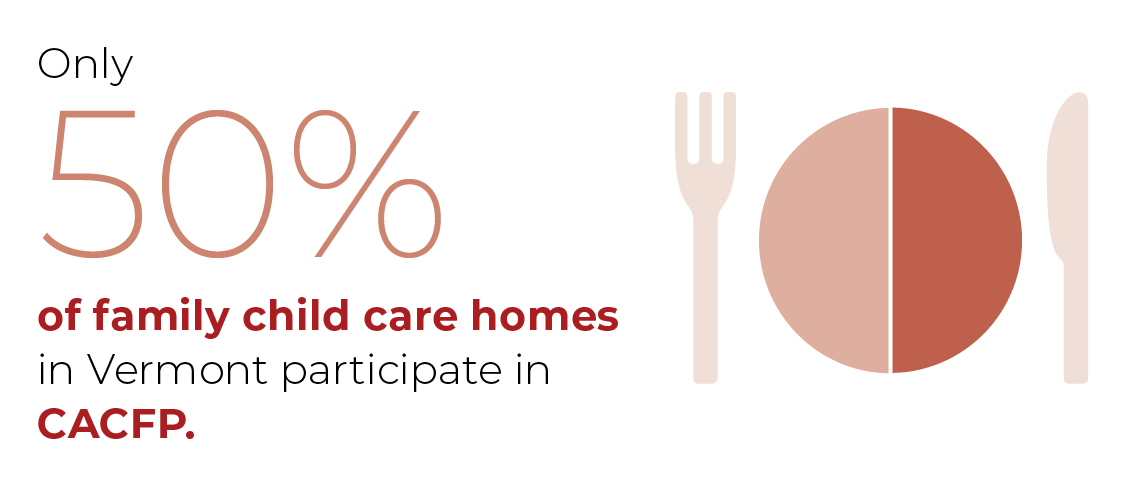 | | This Issue Update newsletter is part of a series that provides more information on each priority issue on the Alliance's 2026 Legislative Agenda. The Legislative Agenda is crafted annually in partnership with early childhood organizations that are advancing legislative policy solutions related to health, safety, food security, economic security, and early care and education. The priority issues were selected by the Alliance's Steering Committee. | | | | The Alliance’s series of virtual Issue Spotlights continues Monday, March 16, at 3:00 pm, and will focus on funding for two important programs – sponsoring organizations in the federal CACFP program, and for the state share of administrative costs related to 3SquaresVT. | | | | | | CACFP Sponsor Funding: Improve Food Access in ECE Settings Under federal program guidelines, a family child care home can only participate in the Child and Adult Care Food Program (CACFP) if they have an agreement with an eligible sponsoring organization. Unfortunately, due to financial restraints, many sponsoring organizations have been forced to drop out of the program, leaving only three active sponsors in Vermont. These organizations are facing critical financial challenges that limit their ability to continue operating as CACFP sponsors. The Alliance supports Hunger Free Vermont’s request for $182,000 in base funding in the FY27 Budget for Vermont’s CACFP sponsor organizations. This funding is critical for supporting the current CACFP sponsoring organizations and incentivizing more organizations to become sponsors, so that more child care providers can participate in CACFP and more young children can have access to nutritious meals. Legislative Update The Governor’s Recommended FY27 Budget did not include any additional funding for CACFP sponsor organizations. The House Education Committee did support including $182,000 in the budget in their FY27 Budget recommendations memo to the House Appropriations Committee. The Appropriations Committee is currently considering the request, and needs to finalize their FY27 Budget proposal by Friday, March 20. | | | |  | Data and Talking Points - As of October of 2024, only 181 of 407 (44%) FCCHs in Vermont were participating in the CACFP.