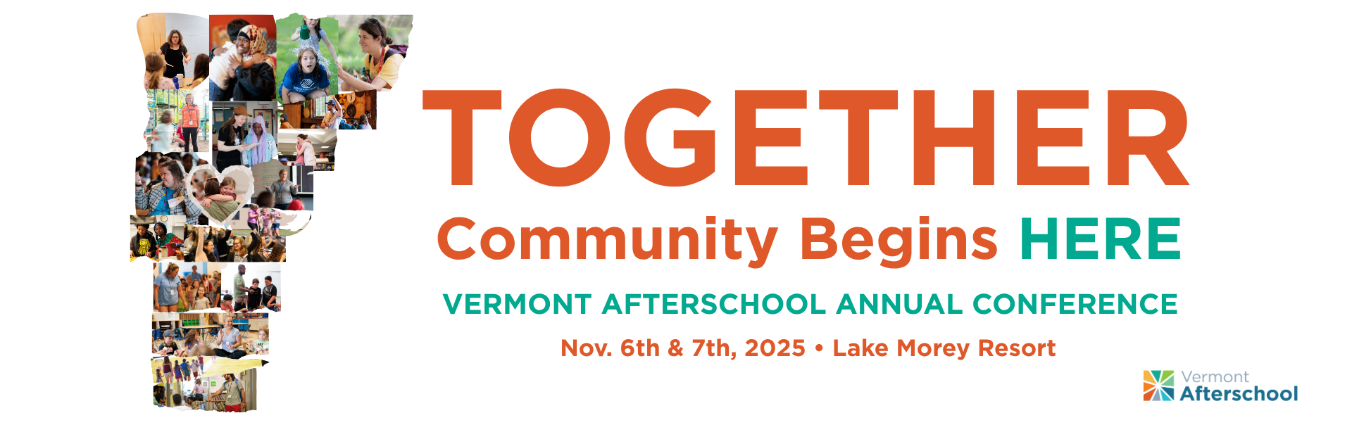 Registration Open for Vermont Afterschool Conference – 11/6 and 11/7 Registration is now open for Vermont Afterschool's 15th Annual Conference. The Conference will be held Thursday and Friday, November 6-7, at Lake Morey Resort. Thursday will feature a half-day, professional development deep-dive specifically for out-of-school time directors and site coordinators. Friday will once again bring together Vermont’s out-of-school time directors, staff, educators, partners, and champions for a full day of workshops across three breakout sessions, networking, and a celebration of the important work you do for Vermont’s children, youth, families, and communities. For more information and to register, visit the Vermont Afterschool website. | |